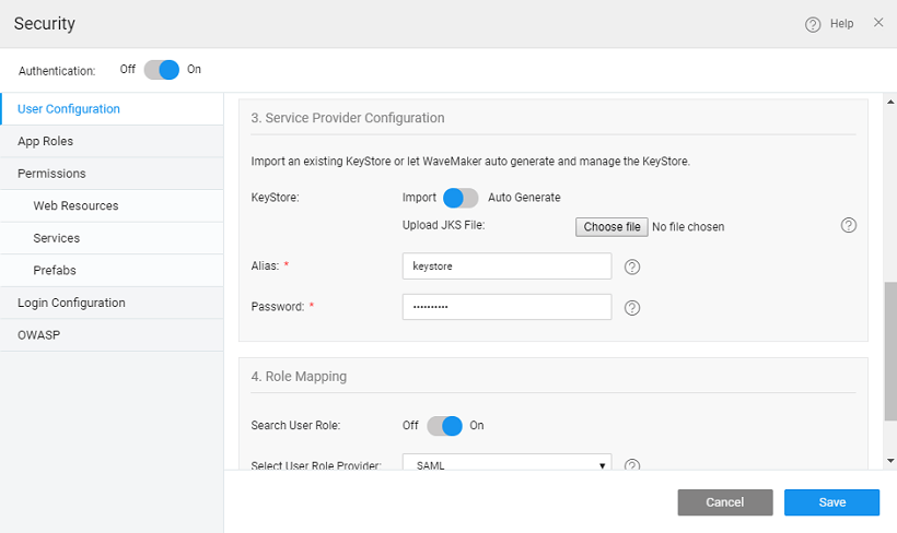 • Import - The user can import a java keystore into WaveMaker. The inputs required are