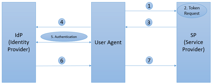In an SSO flow (see the figure below) user U navigates user agent U-A (e.g.a browser) and tries to access a restricted resource on SP (1). The user is not authenticated yet, SP generates a token request (2) and redirects U-A with the token request to IdP (3,4). In the following step, U authenticates himself to IdP (5) according to the supported authentication mechanisms. Subsequently, the security token is issued and sent through U-A to SP, where the integrity and authenticity are verified and the content is evaluated (6,7).