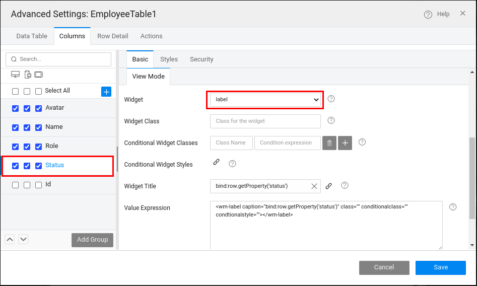The status column renders HTML without displaying inline styles to the column data; this is because WaveMaker applies sanitization to the Label widget.