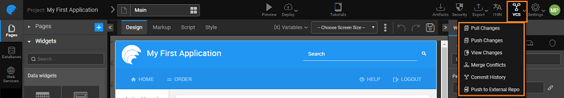 WaveMaker includes an integrated version control system. When you open a project it is checked out from the version control repository. You can pull, push, revert and merge changes back to the repository. WaveMaker version control system by default is hosted on GitLab. You can choose to push your code to an external VCS, too.