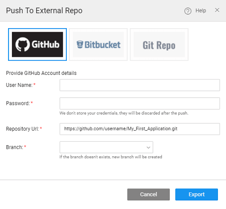 Select the Push to External Repo option from the VCS Menu. You will be prompted to choose from three options: GitHub, Bitbucket or Git Repo. Provide the credentials of the selected repo and the project code will be pushed to that repo using the credentials provided.