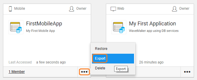 Note: For security reasons, the export project option is restricted to the projects you own. Note: In case the project is using a database, only the data model is exported, data is not included in the export.