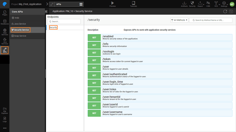 When you enable Security for your application, the Security Services are created. You can view the various methods and their functionality from API Designer.