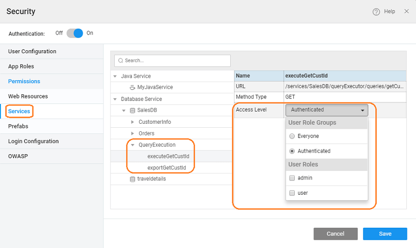 You can configure API permissions from Security dialog. Here you can configure which user can access a particular API depending on User Roles.