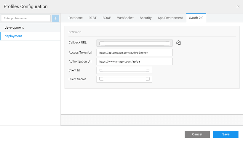 • From the Project Settings under Profile Configuration you can modify OAuth 2.0 configurations. These can be configured seperately for Deployment profile to be used while deploying the app. Remember to register the call back url provided therein with the oauth server.