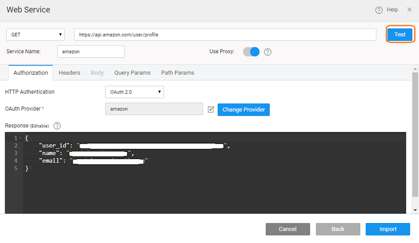 When you have configured the OAuth 2 Provider, Test the configuration to complete the Import process. While testing, you will be prompted to enter the login credentials. This is to obtain the Access Token details and to set the various configuration settings.
