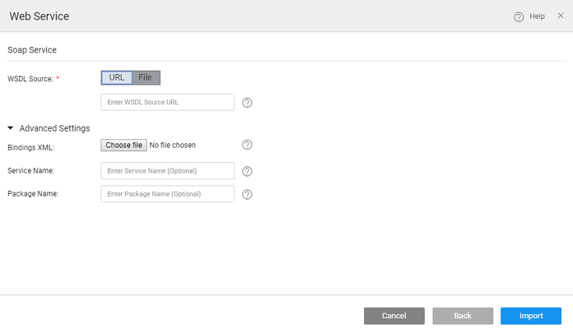 • File: Toggle WSDL Source to File and click Choose File to upload the .wsdl file from your local machine. The file can be an individual file or a group of files packaged into a zip file.