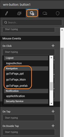 • Button click – Use the button’s On click event to trigger a move to a new page.