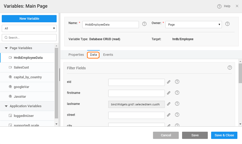 Variables can be bound to each other. Usually, this is the requirement with Variables when the data needs to be filtered i.e. output limited by a constraint or when a Variable which needs parameters as input in order to process information from the data source. These input/filter parameters will be available from the Data tab of the Variable. For example, the Variable corresponding to the Employee CRUD API from the sample hrdb can be filtered on any field of the dataset: