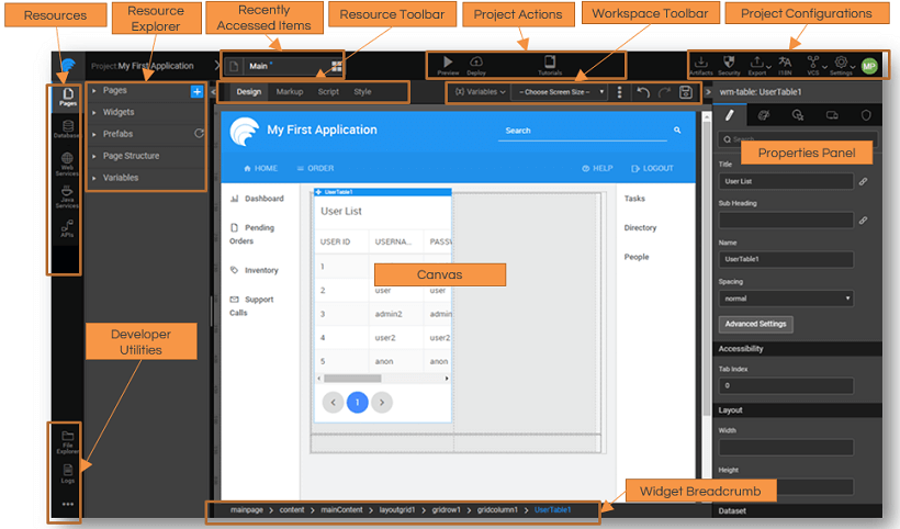 • Workspace Toolbar helps in defining runtime functionality of the Page in terms of Variables, Themes, Layout etc..