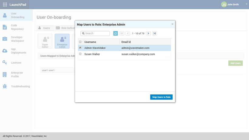 Role-based access control (RBAC) for Rapid, enables certain roles to access specific features of the product. WaveMaker Platform when setup within an enterprise is managed by 2 different types of roles: