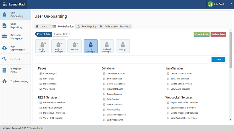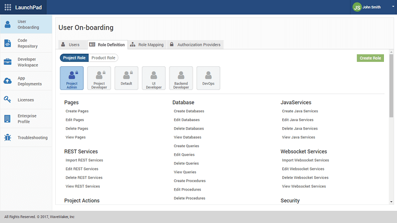 Role-based access control (RBAC) for Rapid, enables certain roles to access specific features of the product. WaveMaker Platform when setup within an enterprise is managed by 2 different types of roles: