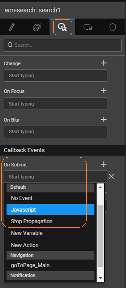2. Using JavaScript - From the event tab, set the onSubmit event to JavaScript. In the Script the following function will be created The selected item can be accessed by '$event.data.item' property as follows: Here we have set the labels to the department name and id returned by the search widget. NOTE: The label names might vary in your project.