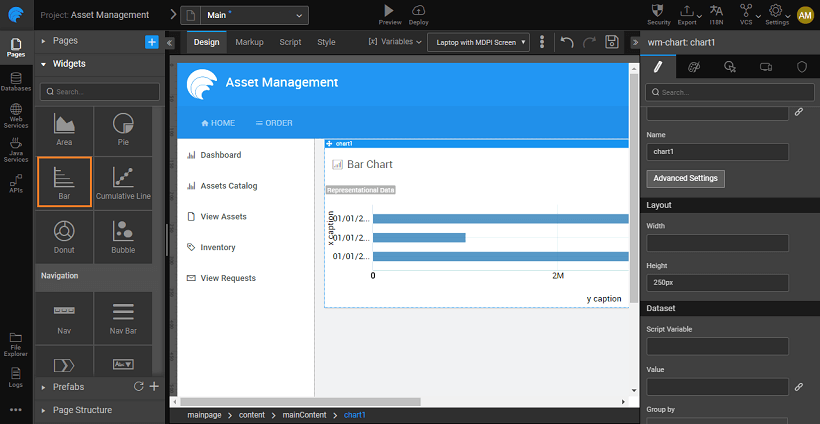 - Go to the page layout of your application and drag-and-drop the required chart widget. Here, we are creating a column chart.