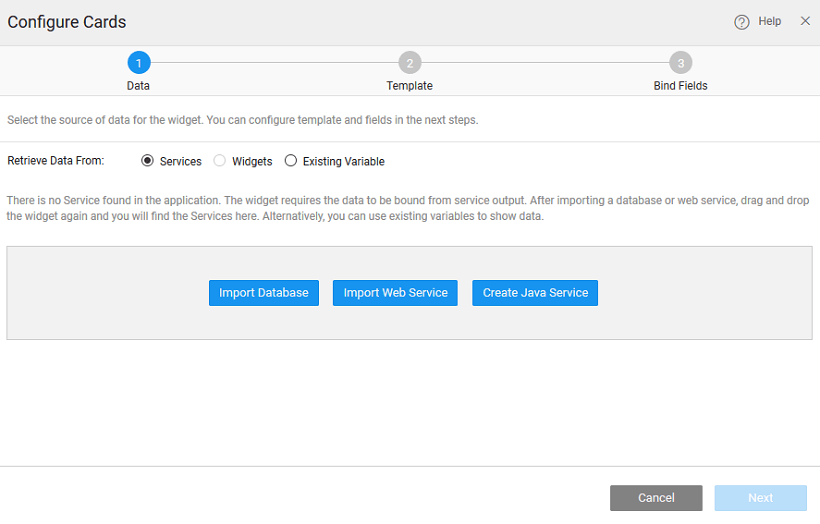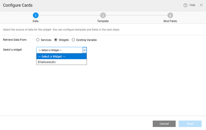 There can be different scenarios to deal with when configuring your Cards Widget with a data source. The data source can be in the form of a service - database, web or Java; or from an another widget on the page.