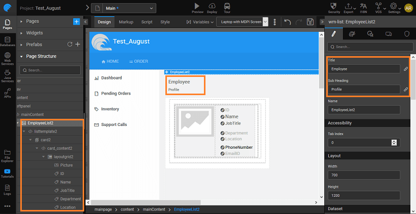The template selected in the step-2 provides a set of widgets that should be bound to the corresponding field from the data source configured in the step-1. Select the widget and bind to the corresponding properties by selecting the field from the drop-down list.