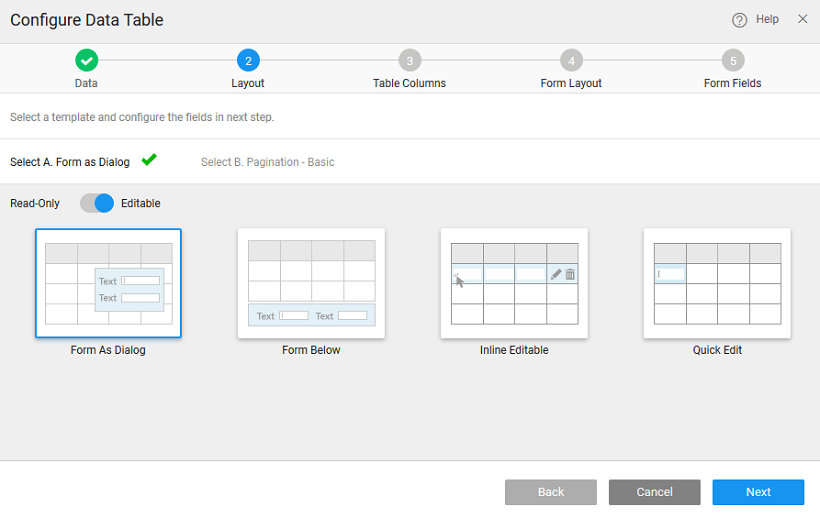 If you select the Data Table layout without Form in step 2, the Done button appears after this step. Click the Done button to add the Data Table to the current page. If you select other layouts, then additional two steps to do include select the Form layout and select the Form fields.