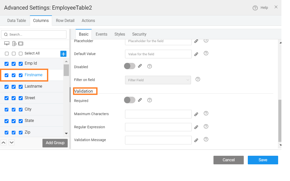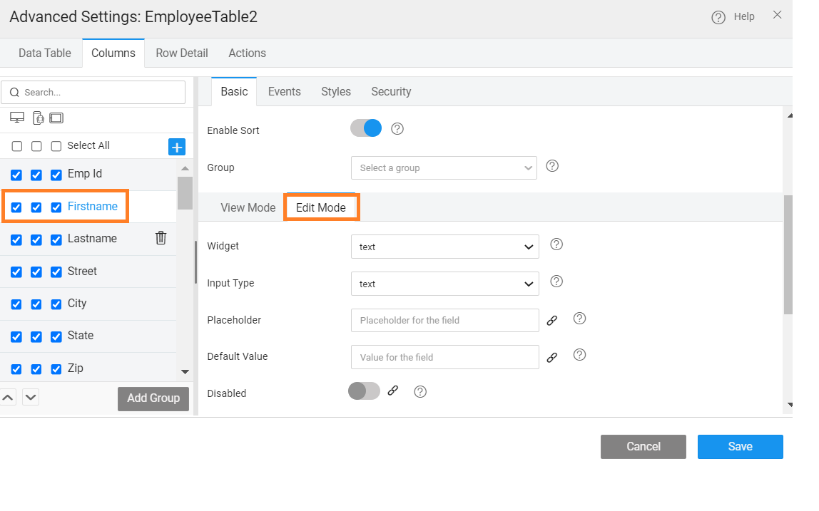 • Value Expression - You can write a custom expression to change the display setting for a table column. The expression needs to follow AngularJS conventions for binding. A sample expression is given which can be enhanced as per the needs of the application.