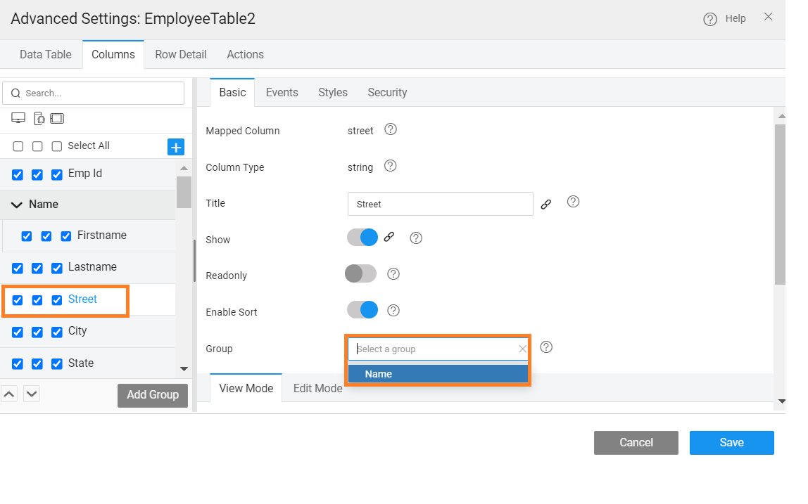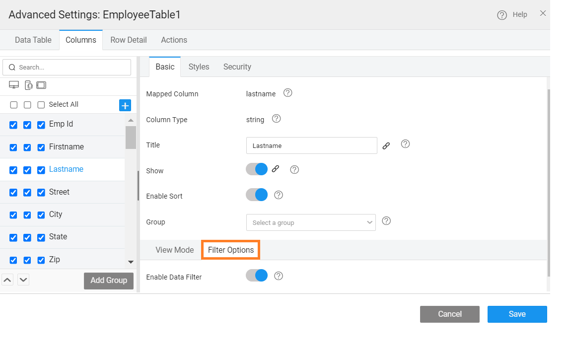 The columns or fields to be displayed in a Data Table can be further configured: