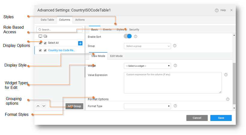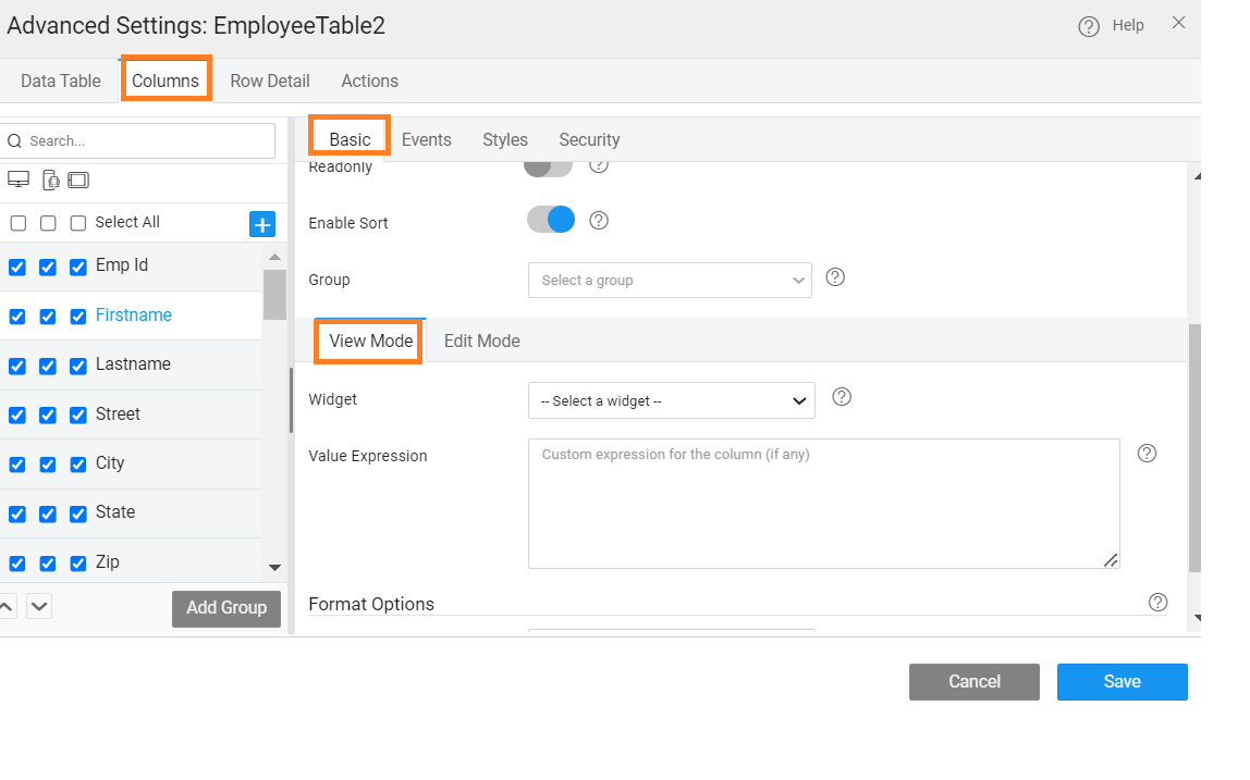 • Value Expression - You can write a custom expression to change the display setting for a table column. The expression needs to follow AngularJS conventions for binding. A sample expression is given which can be enhanced as per the needs of the application.