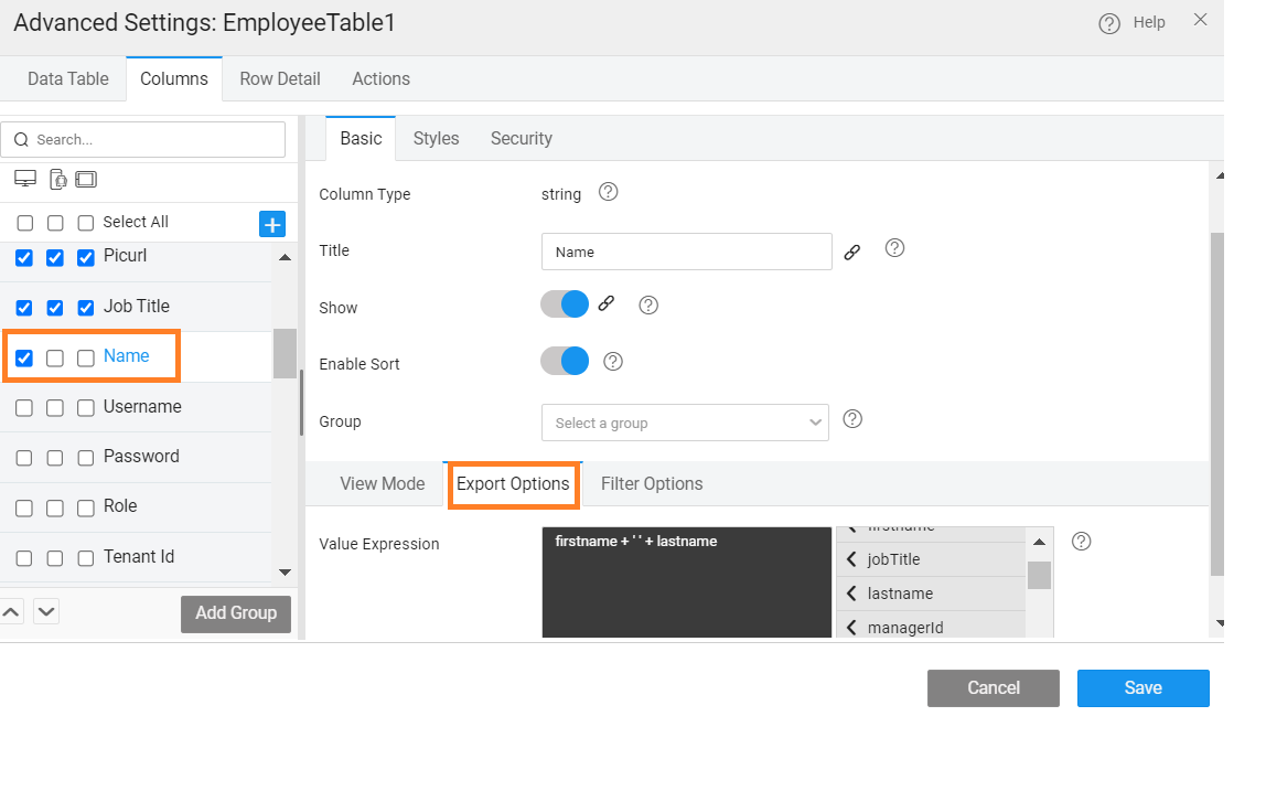 In the case where the export option is set by selecting the Export Format as EXCEL or CSV, the Export Options can be used to customize the export values by setting the Value Expressions. This is particularly useful to display name column as a combined value like 'firstname+lastname' while export.
