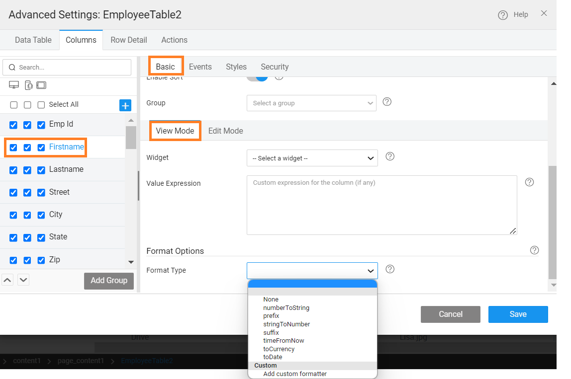 Format Options enables you to define the display format of the column at runtime. The options include toDate, toCurrency, prefix, suffix, and srtingtoNumber. Be aware that these format types selected are only for display purpose. During runtime, edit row will display the values as defined in the data source.
