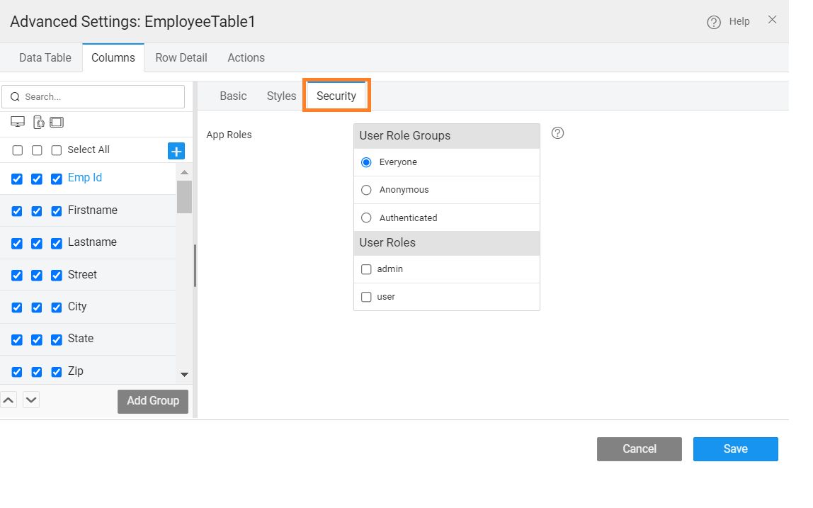 Role-based access can be set to enforce security at column-level: If the security has been enabled in your app, then you can define the app role which has access to a specific column.
