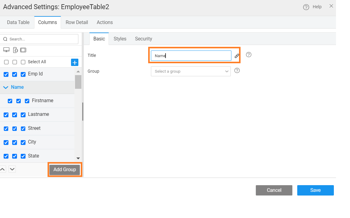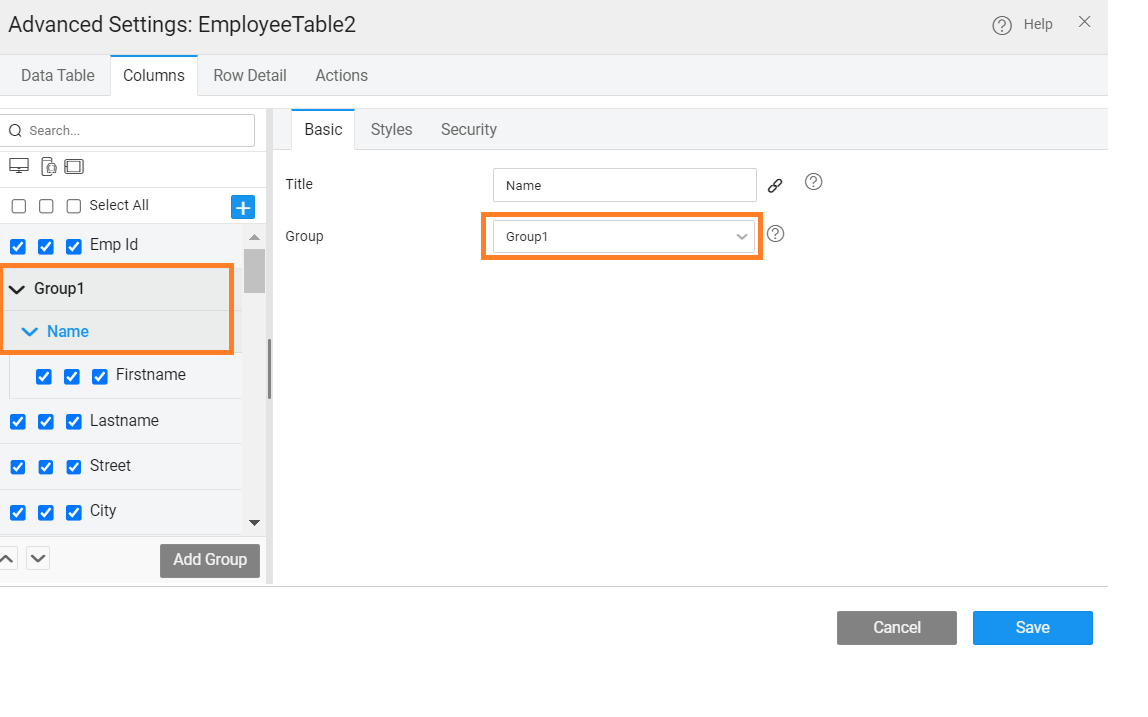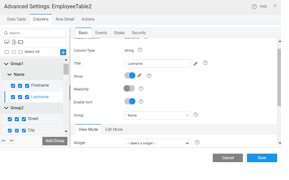 The columns or fields to be displayed in a Data Table can be further configured: