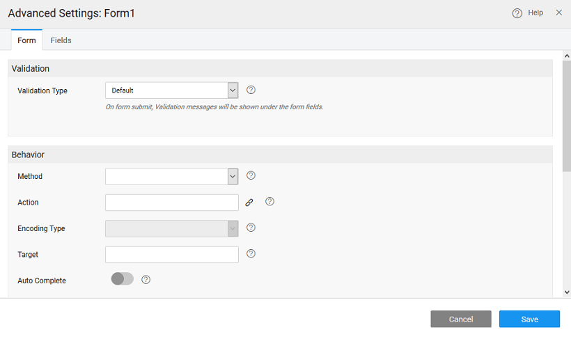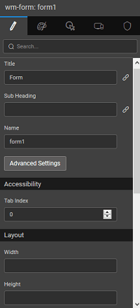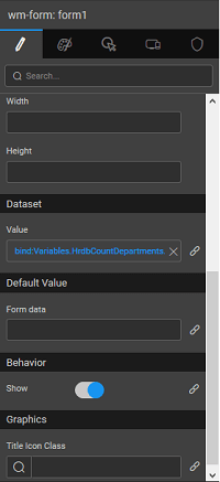 • Default Form Data can be set to value or bound to another widget like Data Table, List or Live Filter. These define the values to be displayed when the Form is first loaded