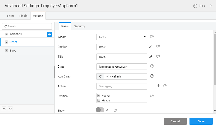 Form Actions include default actions of Save and Reset. You can add your own custom actions, if needed.