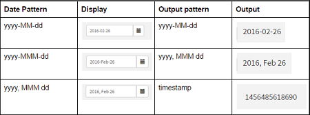 Output FormatDefines the format of output datavalue returned by the date widget. Default output format is 'yyyy-MM-dd', which returns the equivalent data value. E.g data value for '19/06/2015' is '2015-06-19'. If the output format is given as 'MMM dd, yyyy', widget returns datavalue as 'Jun 19, 2015'.