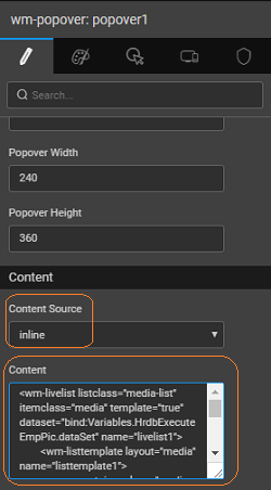1. Set the content source property to the partial and the content as popover page created in the previous step and bind the badge value to the Emp_Count value. Content defines the page to be displayed when the popover link is clicked and badge indicates the number of items that will be displayed in the content.