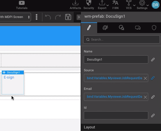 Now bind the Source of the prefab to the URL of the file to be e-signed and the email to the email of the user who will perform the e-signing.