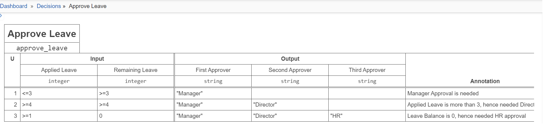 4. Create DMN(Decision Management) table for setting up rules Below is the decision table created using the Camunda DMN.