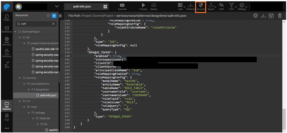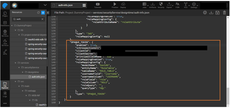 Configure a role table and once the token is validated using the introspection endpoint the current logged-in user role is retrieved from the database. Add modelName, entityName, tableName, usernameField, usernameColumn, roleField, roleColumn or roleQuery, queryType in the JSON structure as shown below.