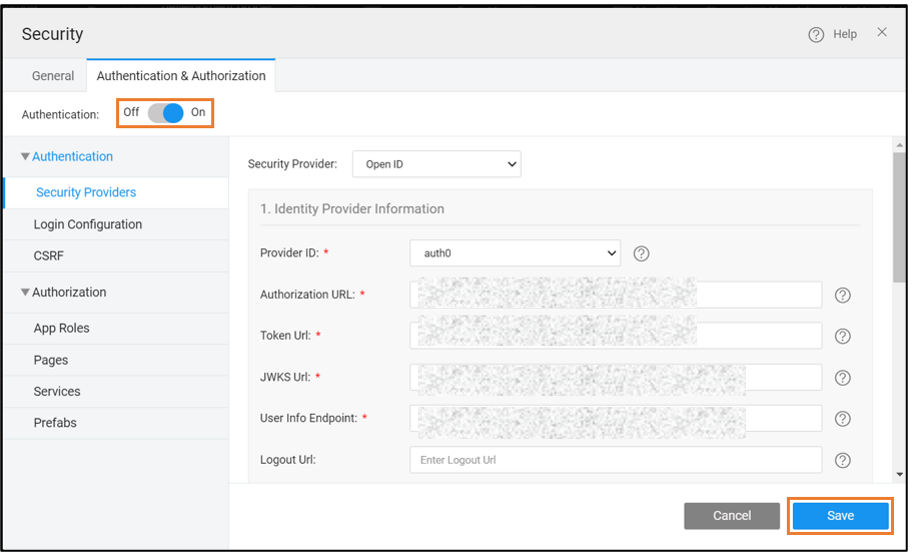 1. Go to the Authentication and Authorization tab to enable the primary security provider. Click Save.
