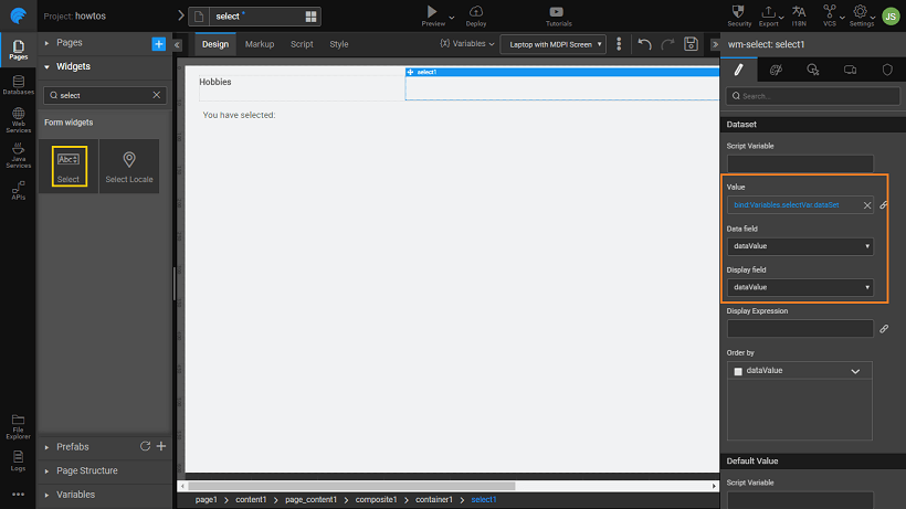 2. Bind the Select Widget to the Static Variable dataset: sel_listvar_bind