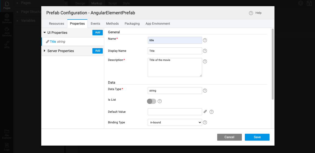 • Inorder to communicate with web components, Prefab has an option called Properties under Prefab Configurations as shown below.
