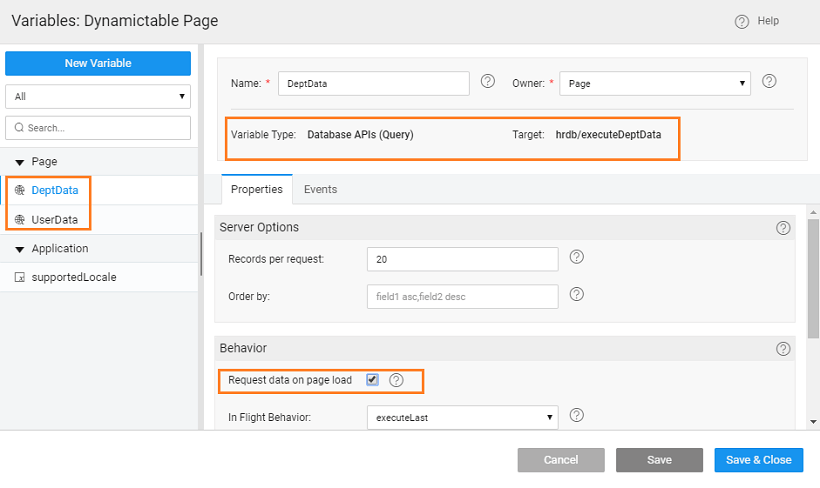 Create a Database API variables for the queries created above. Call them, say DeptData and UserData Note: Make sure you have checked the Request Data on Page Load option for the variables created above.