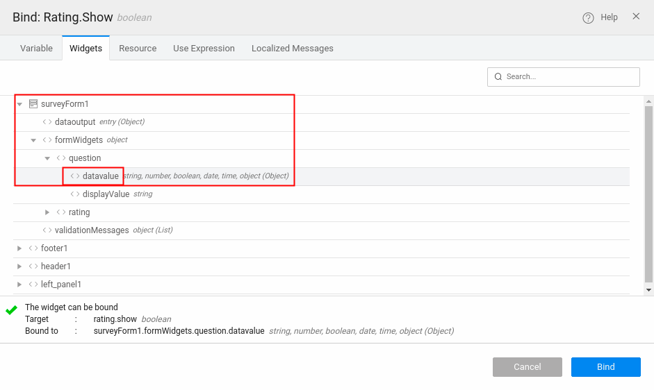 • Select the Widgets tab in binding dialog, select the question field datavalue as shown in the below image.
