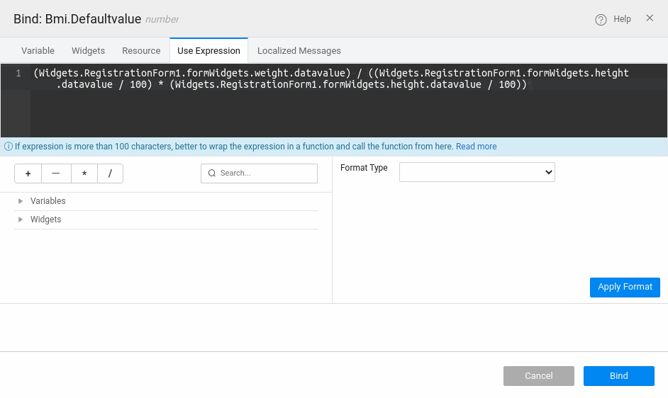 • Click on bind icon and add the logic as below. If the country is US then apply one set of display formats else other display format while entering phone number.