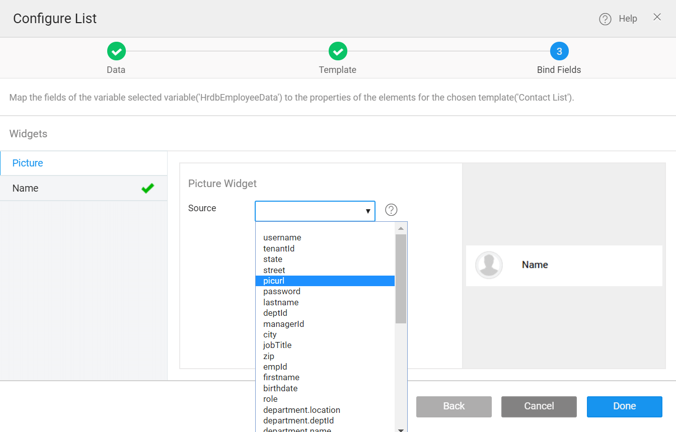 deptID fills with: bind:Widgets.DepartmentTable1.selecteditem.deptId