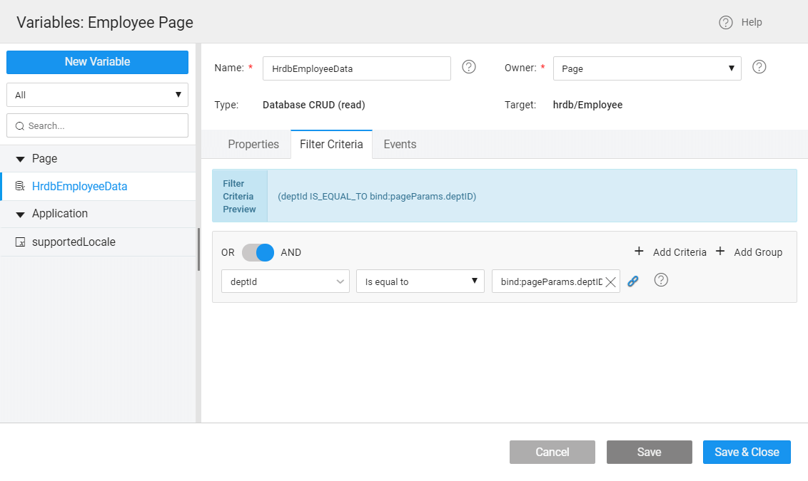 Now, set filter criteria in the variables for HrdbEmployeeData to deptId Is equal to _bind.pageParams.deptID, _as shown in the image below:
