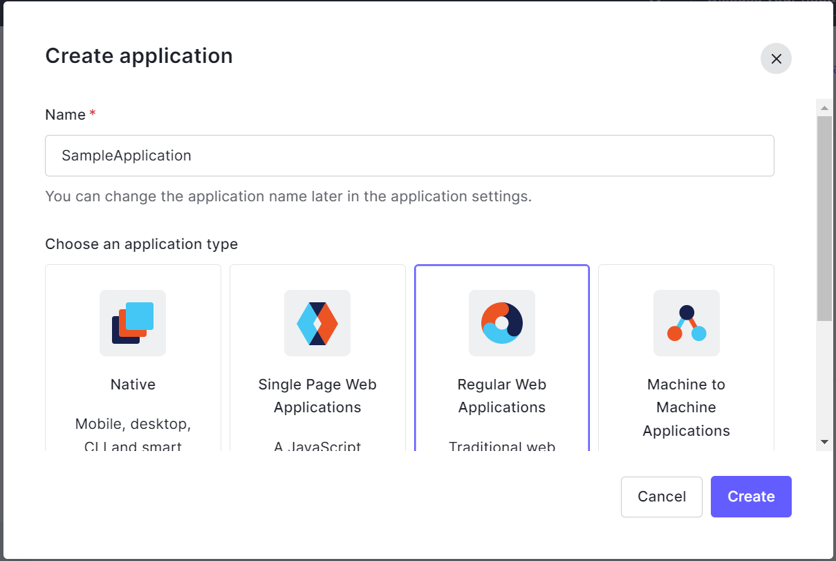 - Click Create Application to start creating an application. Enter the Application name and click Regular Web Application to create a web application.