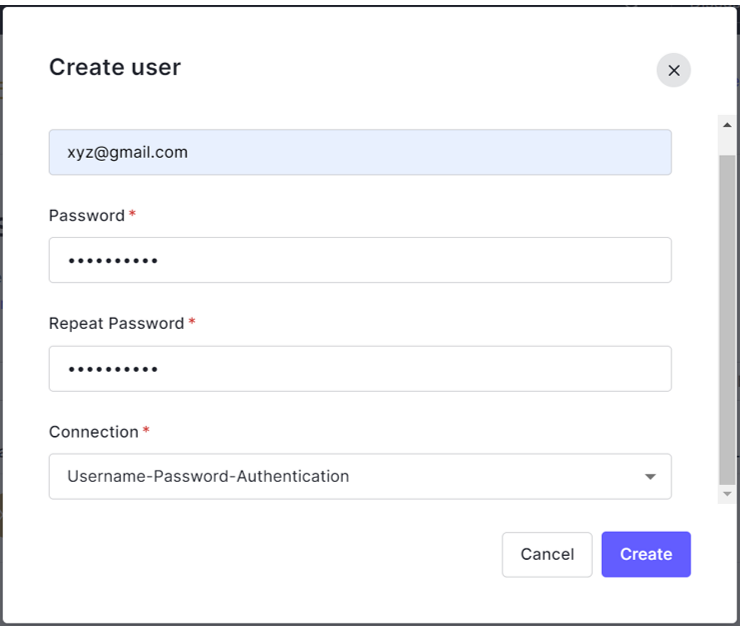- Click Create User. Enter email address and password and save the details to create a new user.