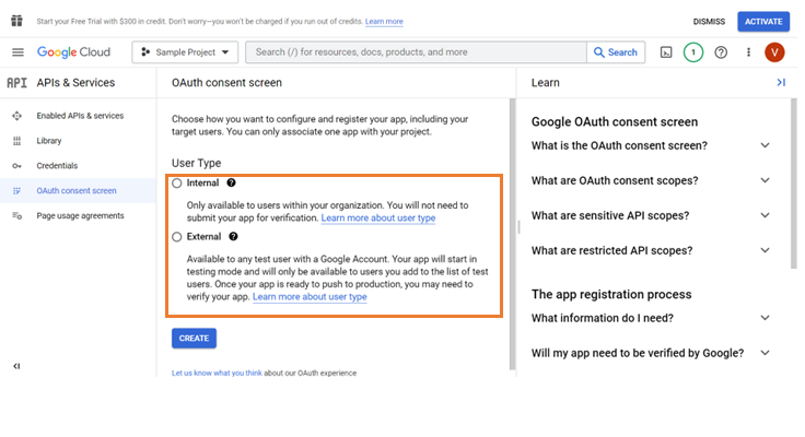 - Select the Internal option to allow the enterprise oriented Google accounts of the authorized domains to be displayed during the time of SSO.