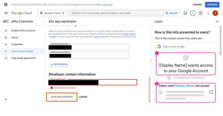 Provide the App name, User support email, Application Logo, Authorized domains, and Email address of the developer. Click Save and Continue.