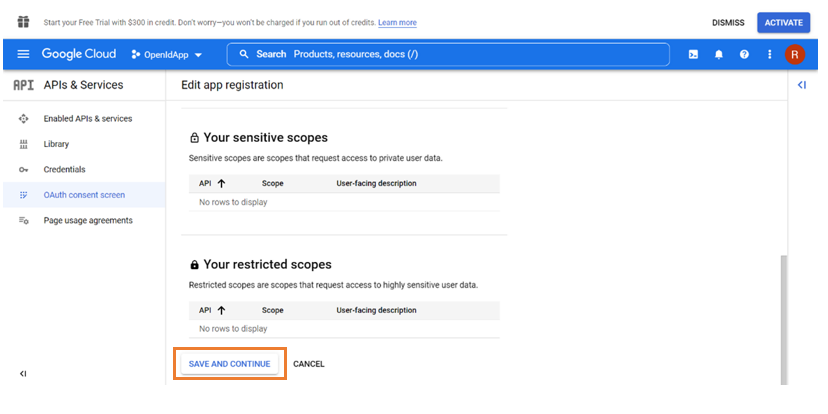 Click Save and Continue to save the provided scope information.