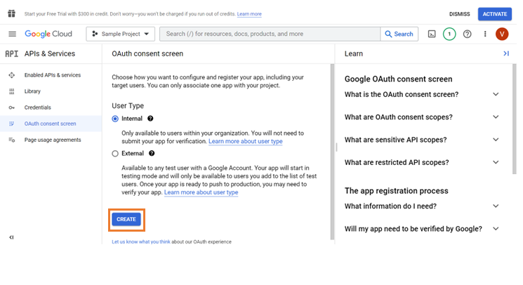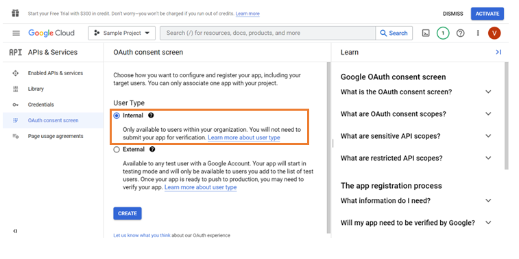- Select the Internal option to allow the enterprise oriented Google accounts of the authorized domains to be displayed during the time of SSO.