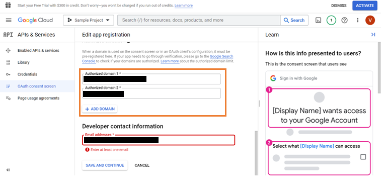 Provide the App name, User support email, Application Logo, Authorized domains, and Email address of the developer. Click Save and Continue.